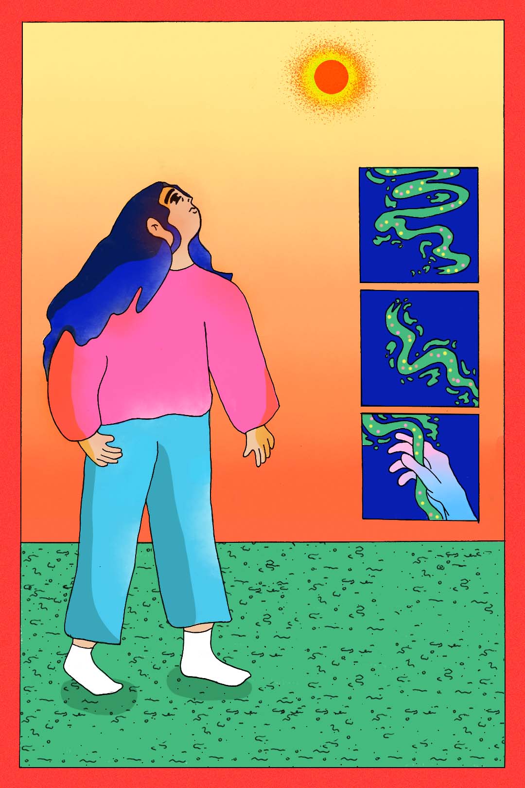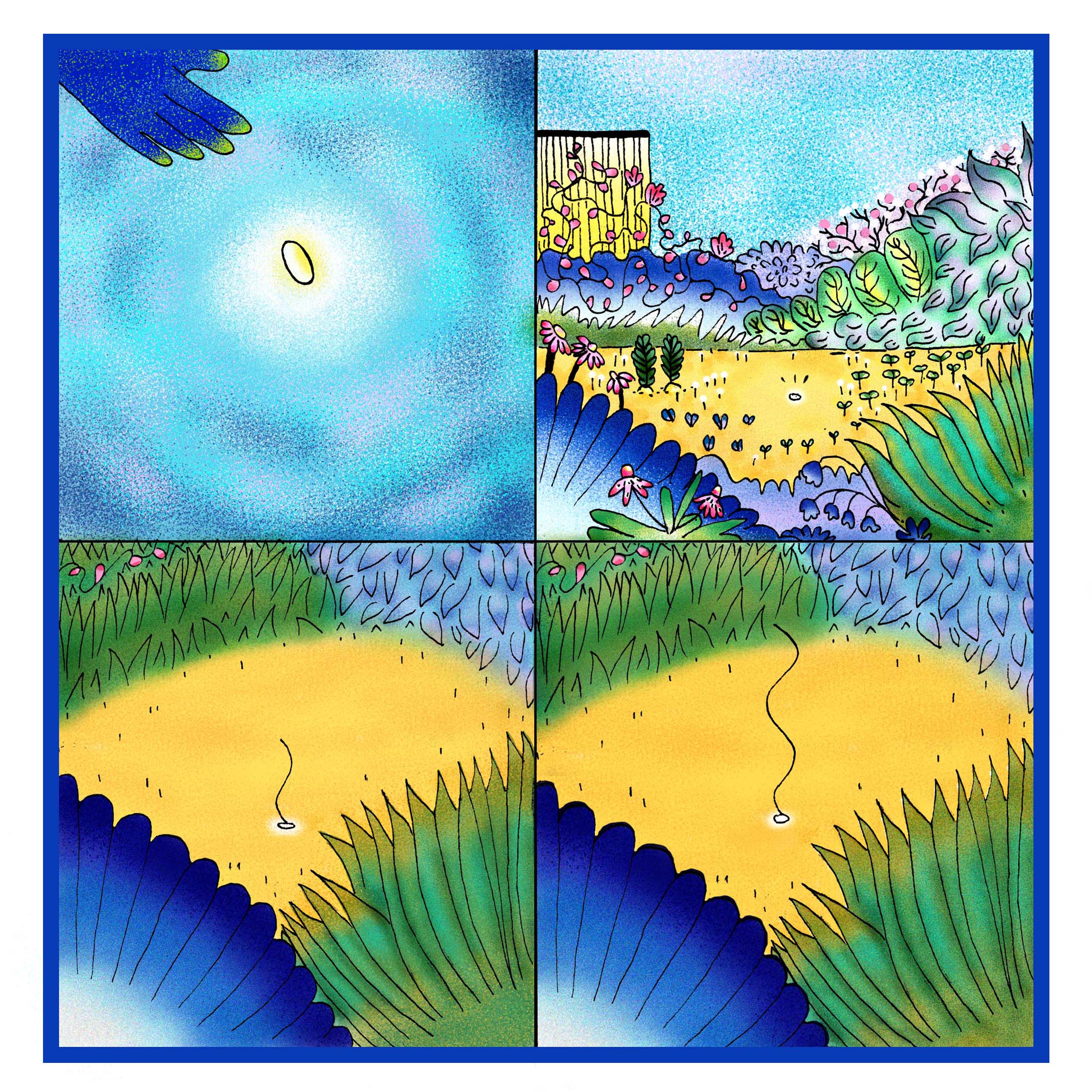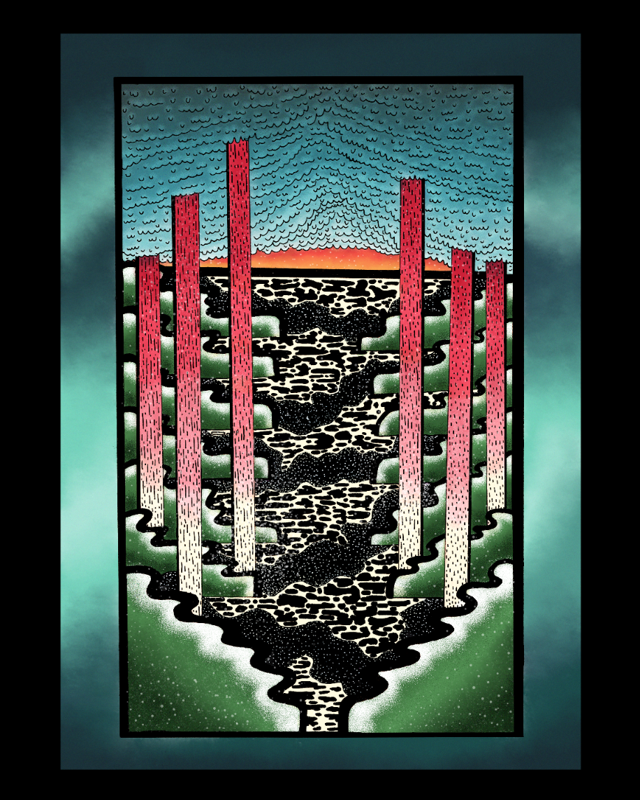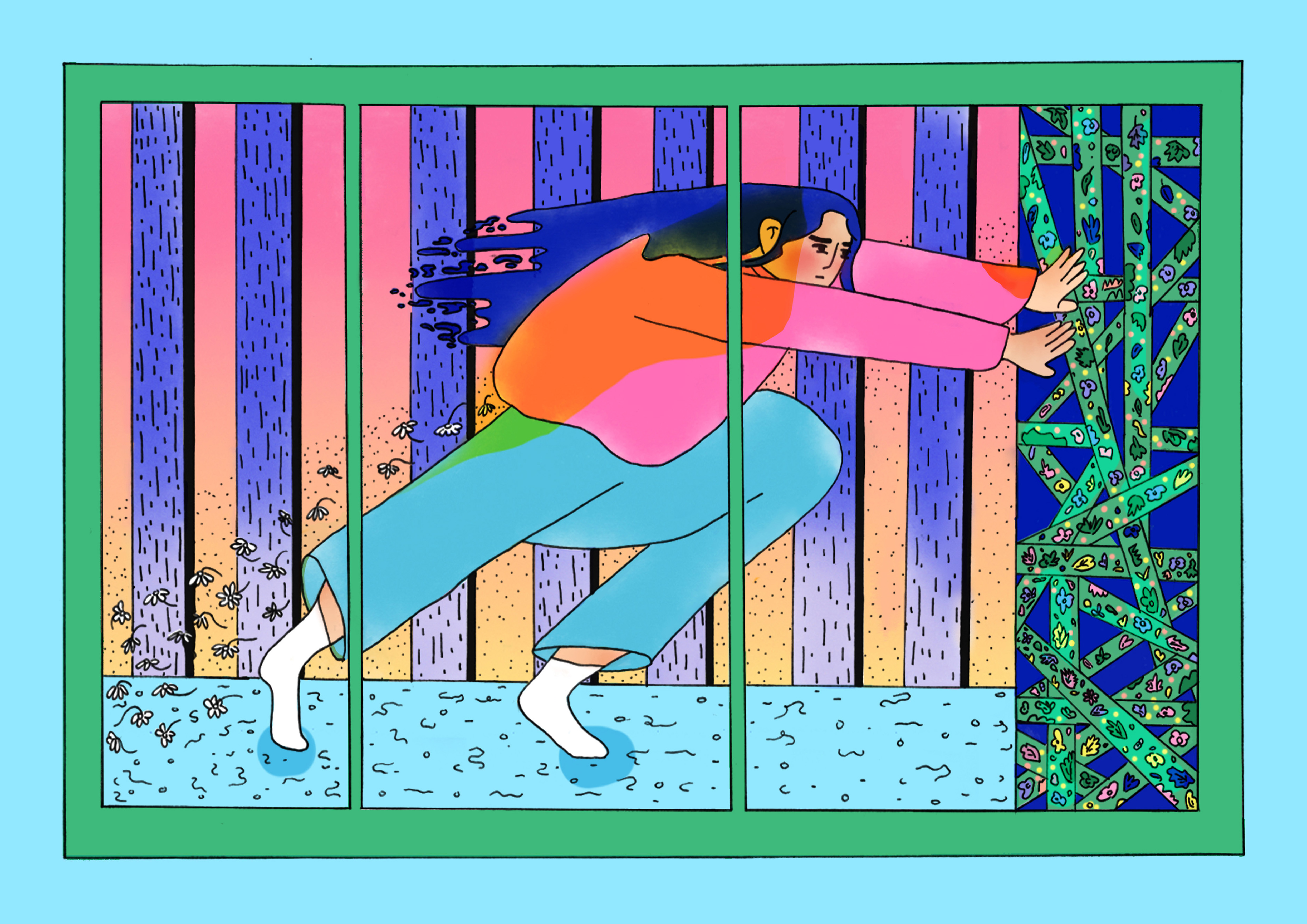 This series of work is a collaboration for Spacebar Magazine Issue 2 Vision with the talented poet Holly Loveday. In which she details in her poem Outside Dublin her feelings of claustrophobia during lockdown and dreaming of escaping to somewhere more natural. I illustrated the characters experience into these 3 paneled narratives.