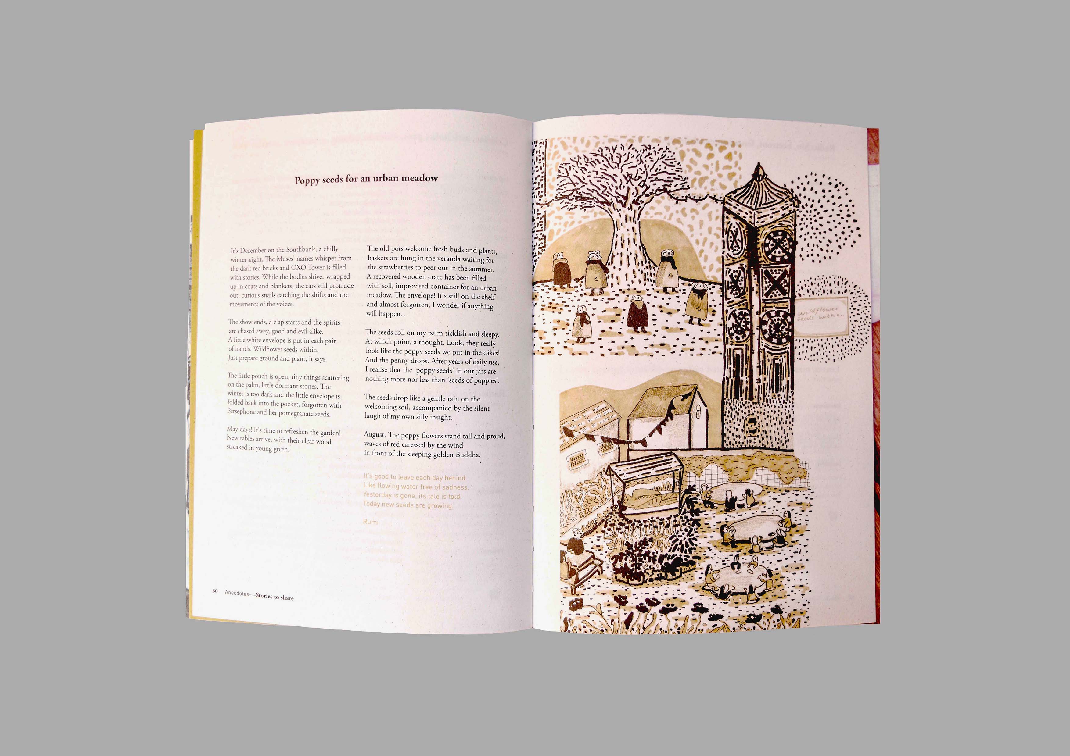 A vegetarian cookbook produced in collaboration with Cafe Jamyang and the students and staff from London College of Communication in Elephant and Castle. Designed and Ilustrated by the students and published at the university on organic paper and eco inks, the books tells the story of the people, ethos